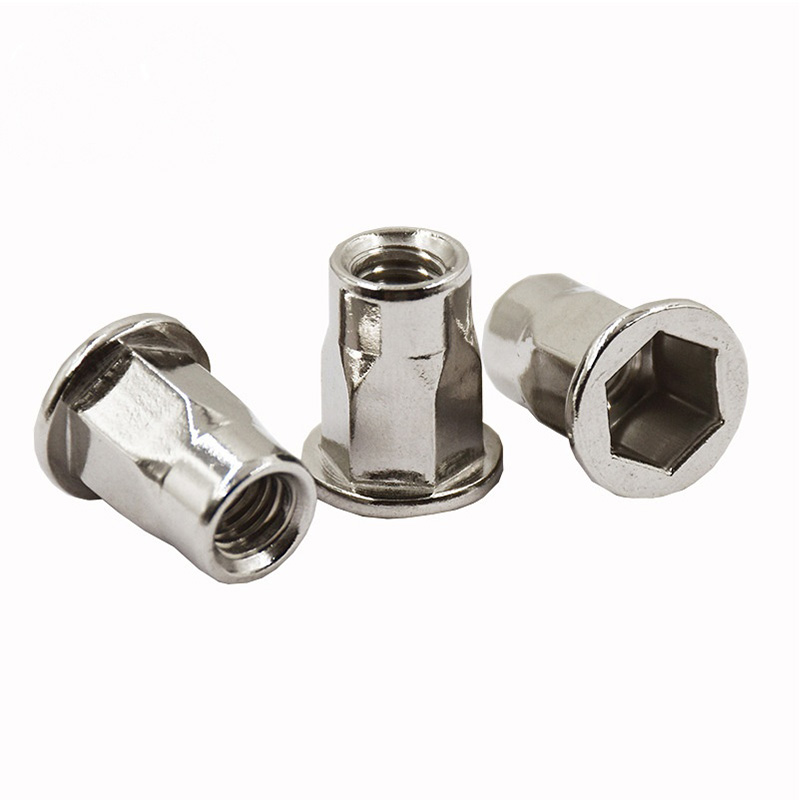 आम्ही ब्लाइंड साइड हेक्स रिव्हेट नट्ससाठी त्यांच्या थ्रेडच्या आकारांनुसार सामान्य वैशिष्ट्यांची यादी करतो—M3, M4, M5, M6, M8, M10 आणि M12 सारख्या गोष्टी तुम्हाला सहसा सापडतील. आम्ही हे फास्टनर्स कार्बन स्टील, स्टेनलेस स्टील (ग्रेड 304 आणि 316 नेहमीच्या आहेत) आणि ॲल्युमिनियम सारख्या वेगवेगळ्या सामग्रीपासून बनवतो. मजबुतीसाठी काय आवश्यक आहे आणि ते गंजण्यास किती चांगले आहे यावर आधारित आम्ही सामग्री निवडतो. उदाहरणार्थ, कार्बन स्टील नट 4.8 किंवा 6.8 सारख्या मजबुती वर्गांनुसार जाऊ शकतात, तर स्टेनलेस स्टील ग्रेड सिस्टमच्या वेगळ्या संचाचे अनुसरण करतात. ही उत्पादने विशिष्ट उद्योग मानकांना चिकटून राहण्यासाठी देखील डिझाइन केलेली आहेत, जे त्यांच्या आकाराचे नियम आणि ते किती चांगले कार्य करतात - जसे की ते देण्याआधी ते किती टॉर्क हाताळू शकतात.