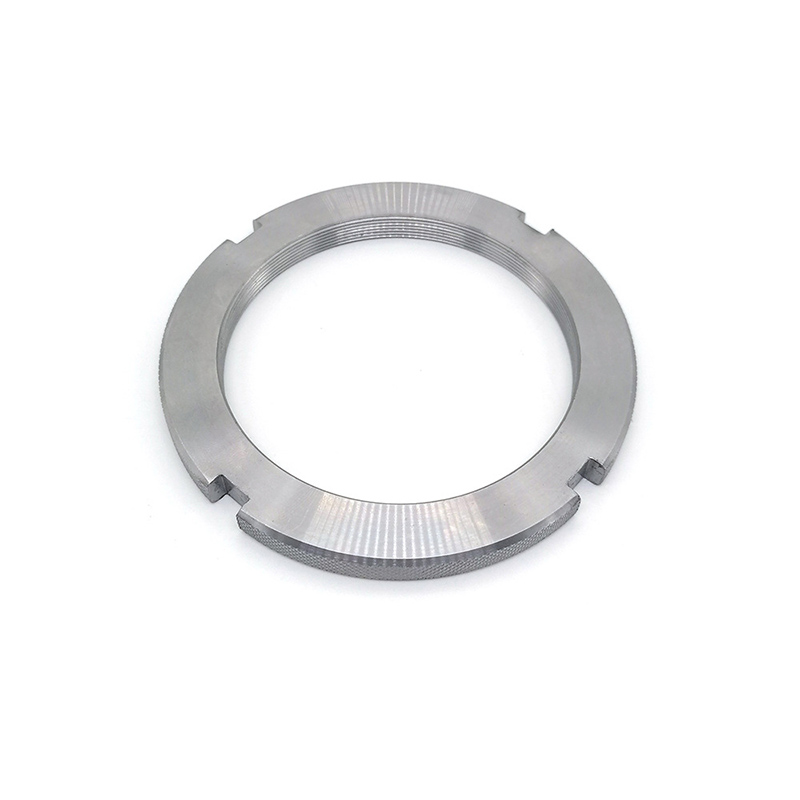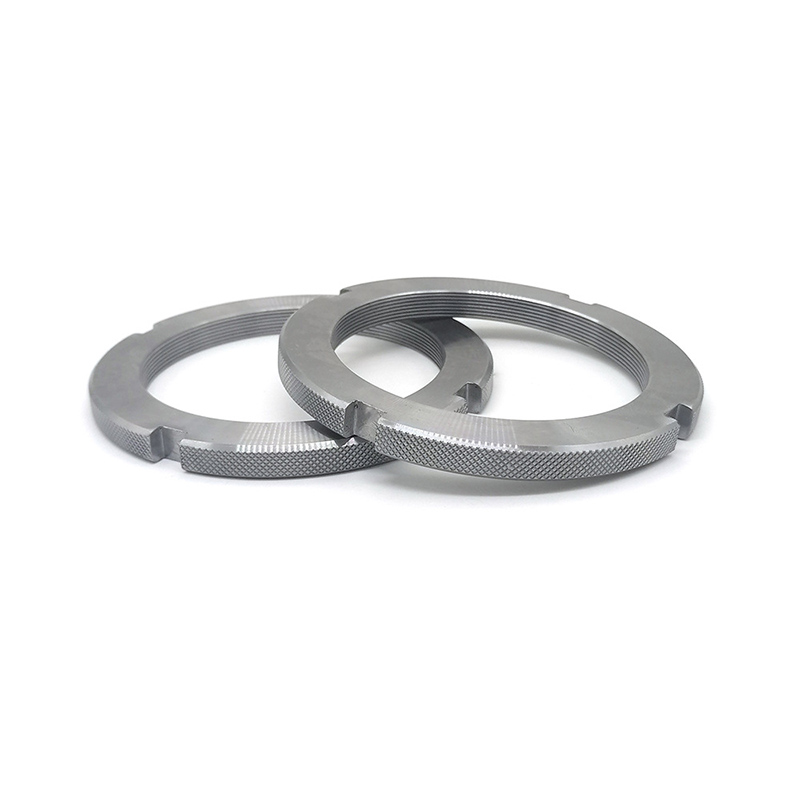 पूर्णपणे थ्रेडेड स्लॉटेड राउंड नट्स - ते डीआयएन 546 सारख्या मानकांनुसार परिभाषित केले जातात आणि मुख्यतः सुरक्षित फास्टनिंग कनेक्शन मिळविण्यासाठी वापरले जातात आणि कंपनांना तोंड देऊ शकतात. या नटांचे मुख्य वैशिष्ट्य नटच्या एका टोकाला कापलेल्या स्लॉटमध्ये आहे. ते कसे वापरायचे ते येथे आहे: प्रथम, नटला प्री-ड्रिल केलेल्या बोल्ट किंवा स्टडवर स्क्रू करा आणि इच्छित स्थितीत घट्ट करा. घट्ट केल्यानंतर, बोल्ट शाफ्टवरील छिद्रासह स्लॉट संरेखित करा. शेवटी, ओपन पिन (लॉकिंग वॉशर) किंवा सेफ्टी लाईन संरेखित स्लॉट आणि बोल्ट होलमधून घाला आणि नंतर सुरक्षित फिट असल्याची खात्री करण्यासाठी पिनचे टोक वाकवा. अशा प्रकारे, कंपनांच्या उपस्थितीत, नट सैल होणार नाही.