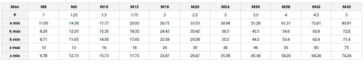 उंचीउंची 1.5 डी सह षटकोन काजूबोल्टच्या व्यासाच्या 1.5 पट समान आहे (उदाहरणार्थ, एम 10 नट = 15 मिमीची उंची). हेक्साडेसिमल एज टूल ग्रिपसाठी खूपच तीक्ष्ण आहे आणि आयएसओ मानकांनुसार धागा तंतोतंत कापला जातो.