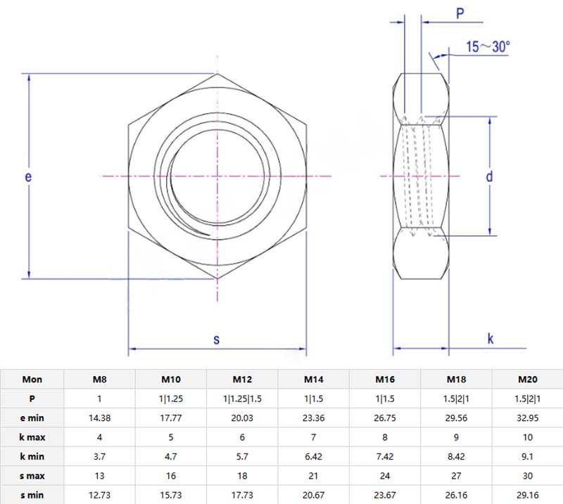 मेट्रिक बारीक पिच थ्रेडसह हेक्सागॉन पातळ काजूबारीक पिच थ्रेड वापरा, सामान्यत: वापरल्या जाणार्या थ्रेड वैशिष्ट्ये एम 6 एक्स 0.75 किंवा एम 8 एक्स 1.0 आहेत. खडबडीत पिच थ्रेडच्या तुलनेत, त्याचा प्रभाव प्रतिकार अधिक मजबूत आहे. सामग्री स्टेनलेस स्टील किंवा पितळ आहे.