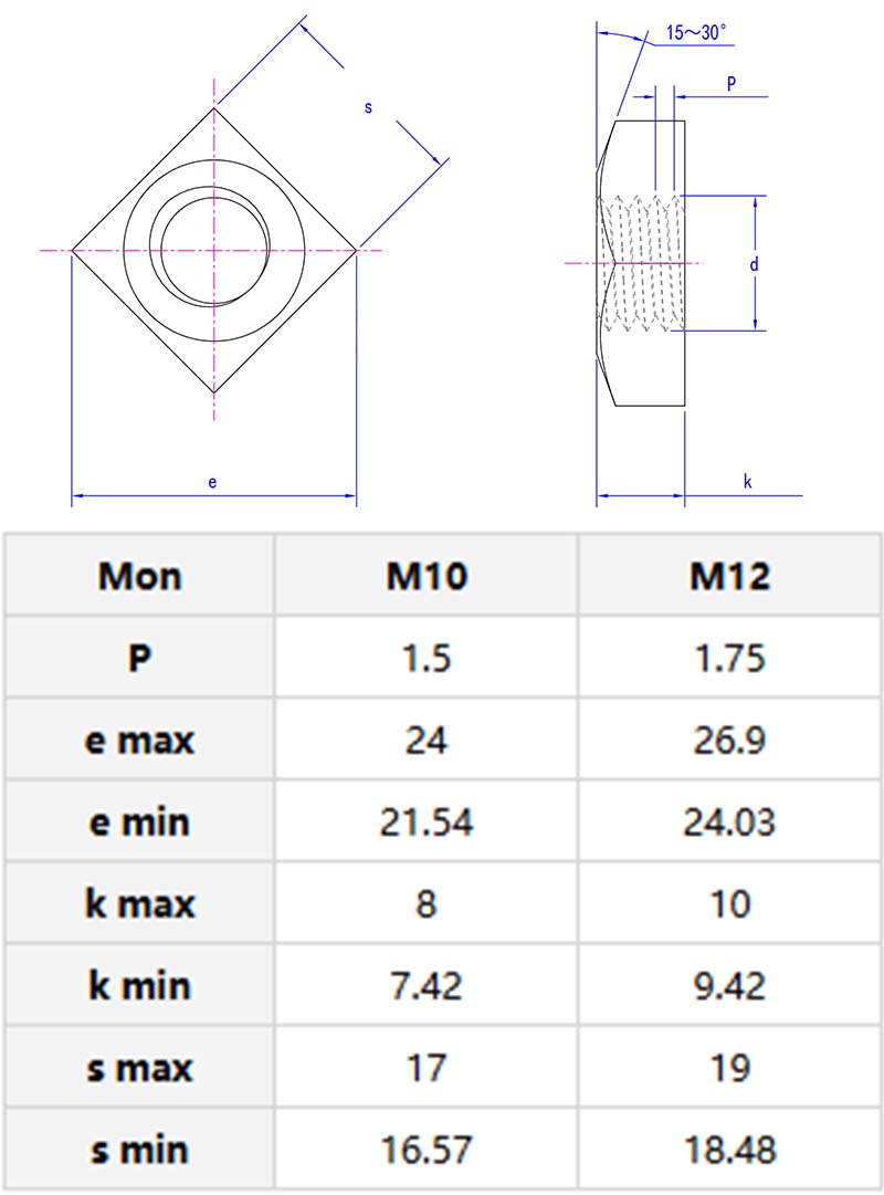 फ्लॅट्समध्ये मोठ्या प्रमाणात स्क्वेअर नट एक हेवी ड्यूटी फास्टनर आहे जो उच्च लोड वातावरणात वापरण्यासाठी डिझाइन केलेले आहे. त्याची मोठी आकाराची पृष्ठभाग (उलट बाजू) नट आणि टॉर्क नियंत्रणावरील रेंचची पकड वाढवते. हे सामान्यत: बांधकाम, यंत्रसामग्री किंवा कृषी उपकरणांमध्ये बोल्ट सुरक्षित करण्यासाठी वापरले जाते.