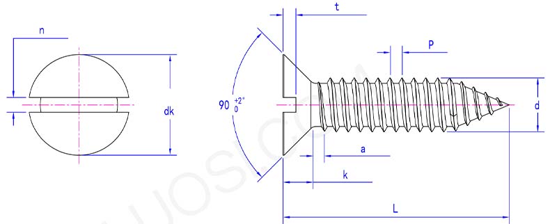 टाईप सी स्लॉटेड काउंटरसंक हेड टॅपिंग स्क्रूचा टॅपिंग कोन अंदाजे 100° असतो आणि ते संबंधित काउंटरसंक होल असलेल्या सामग्रीच्या पृष्ठभागासह फ्लश केले जाऊ शकतात. दुसऱ्या टोकाला एक थ्रेडेड रॉड आहे जो प्री-ड्रिल केलेल्या छिद्रांशिवाय सामग्रीमध्ये स्वतःचे धागे मशीन करू शकतो.